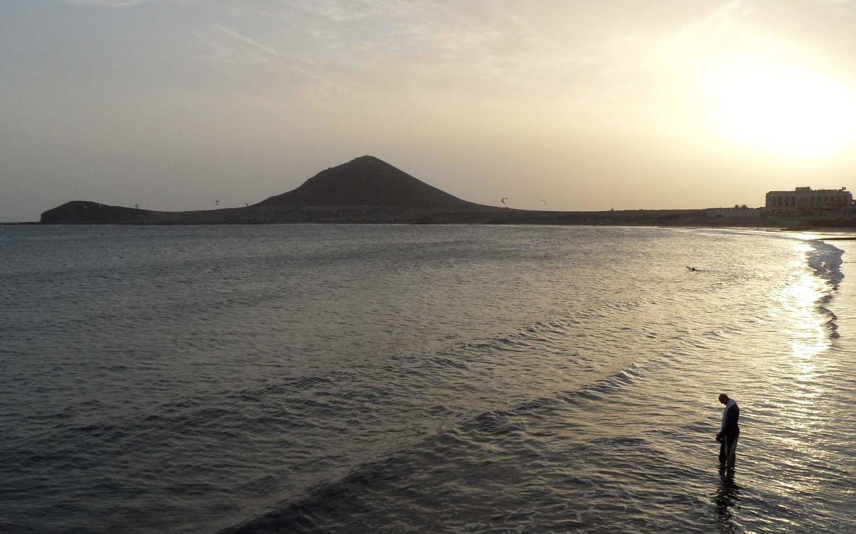 Strand und Montaña roja am Abend von der Hotelterasse aus