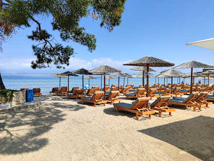 Strand mit neuen, stabilen Holzliegen