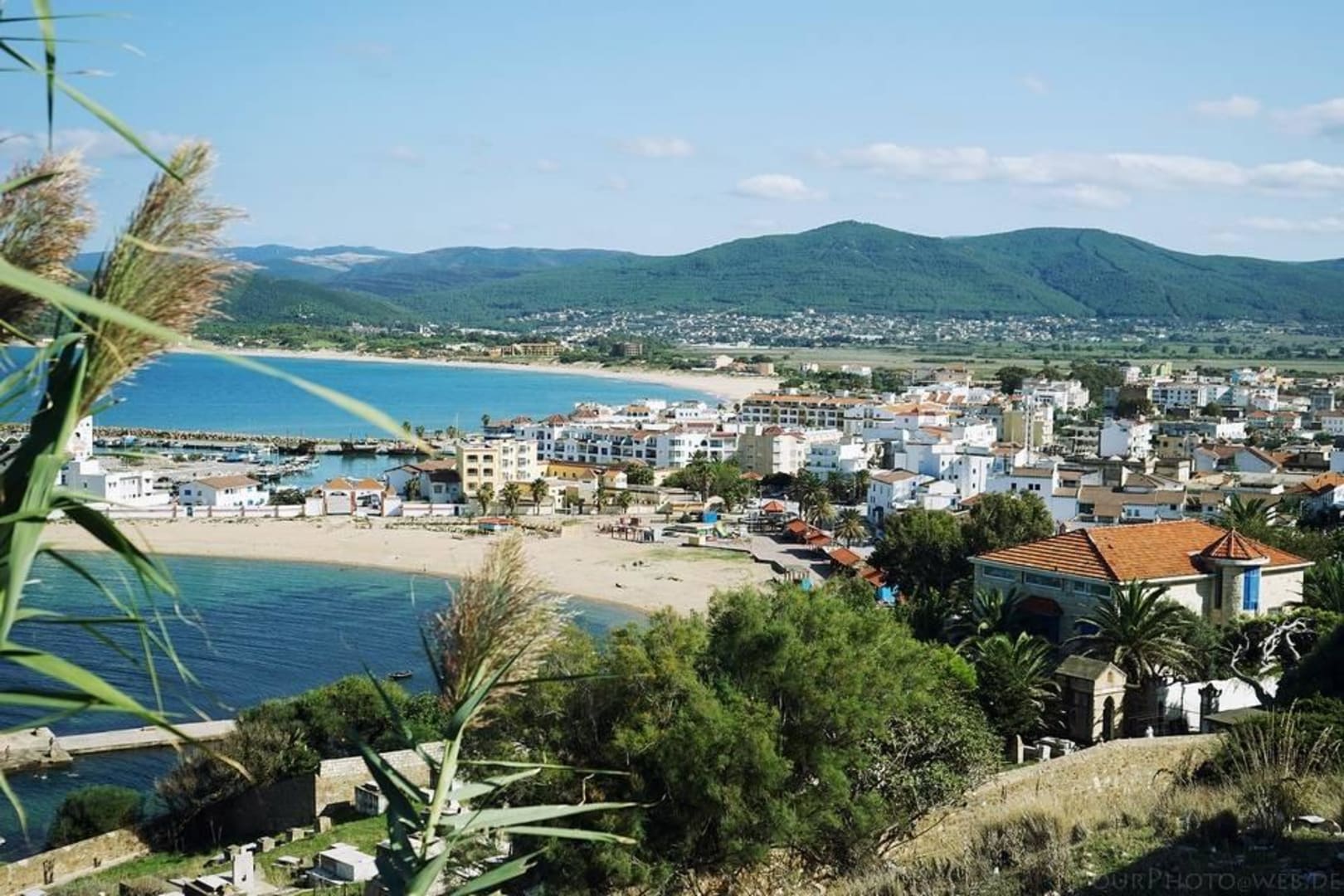 Blick auf die Buchtwunderschöne Bucht und kleiner Hafen von Tabarka. Mehari Hotel direkt am Strand.