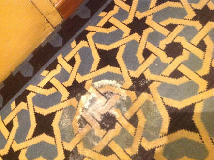 verschmutzter, sehr in die Jahre gekommener Teppich im Flur