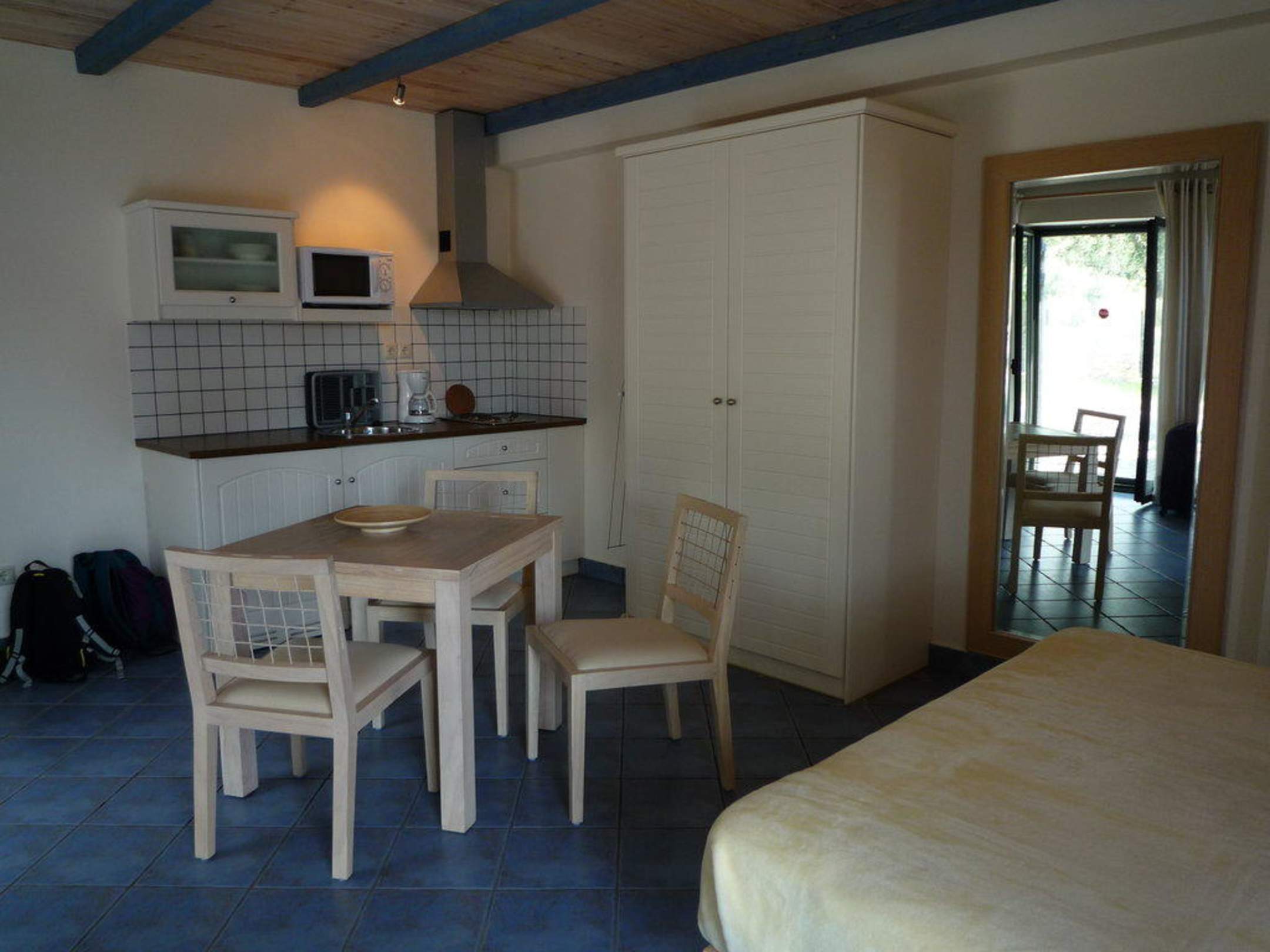 Blick vom Eingang zur Küchenzeile, im Spiegel ist der Ausgang zur Terasse zu sehen