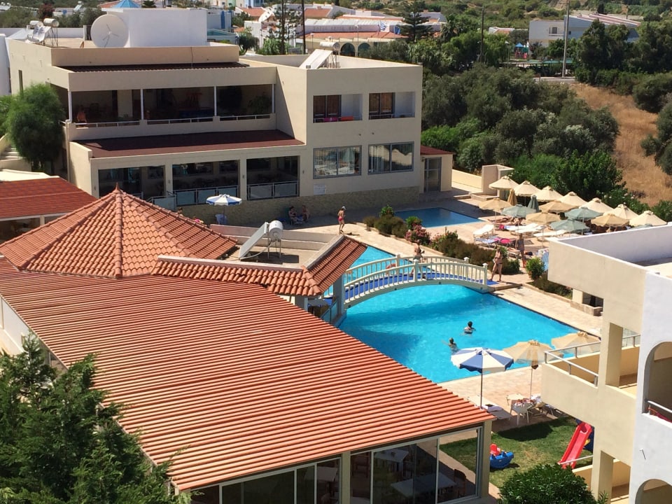 Blick auf die Poolanlage und die Sonnenterrasse!