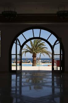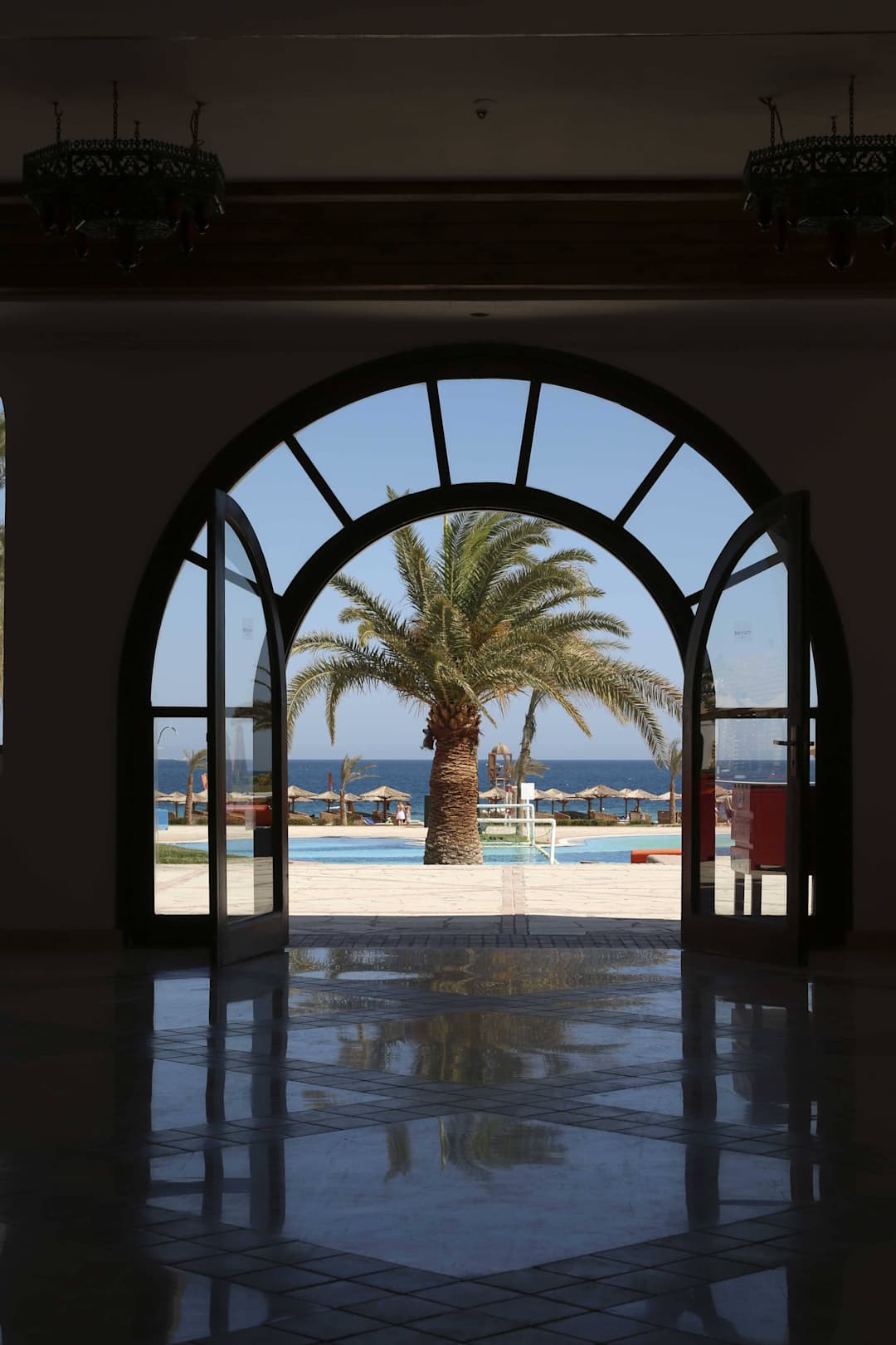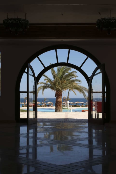 Blick aus der Lobby auf den Pool und Strand