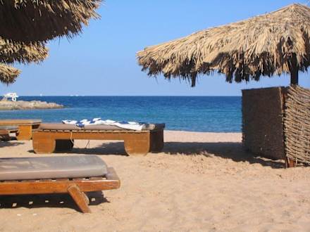 Liegen und Schirme am Strand