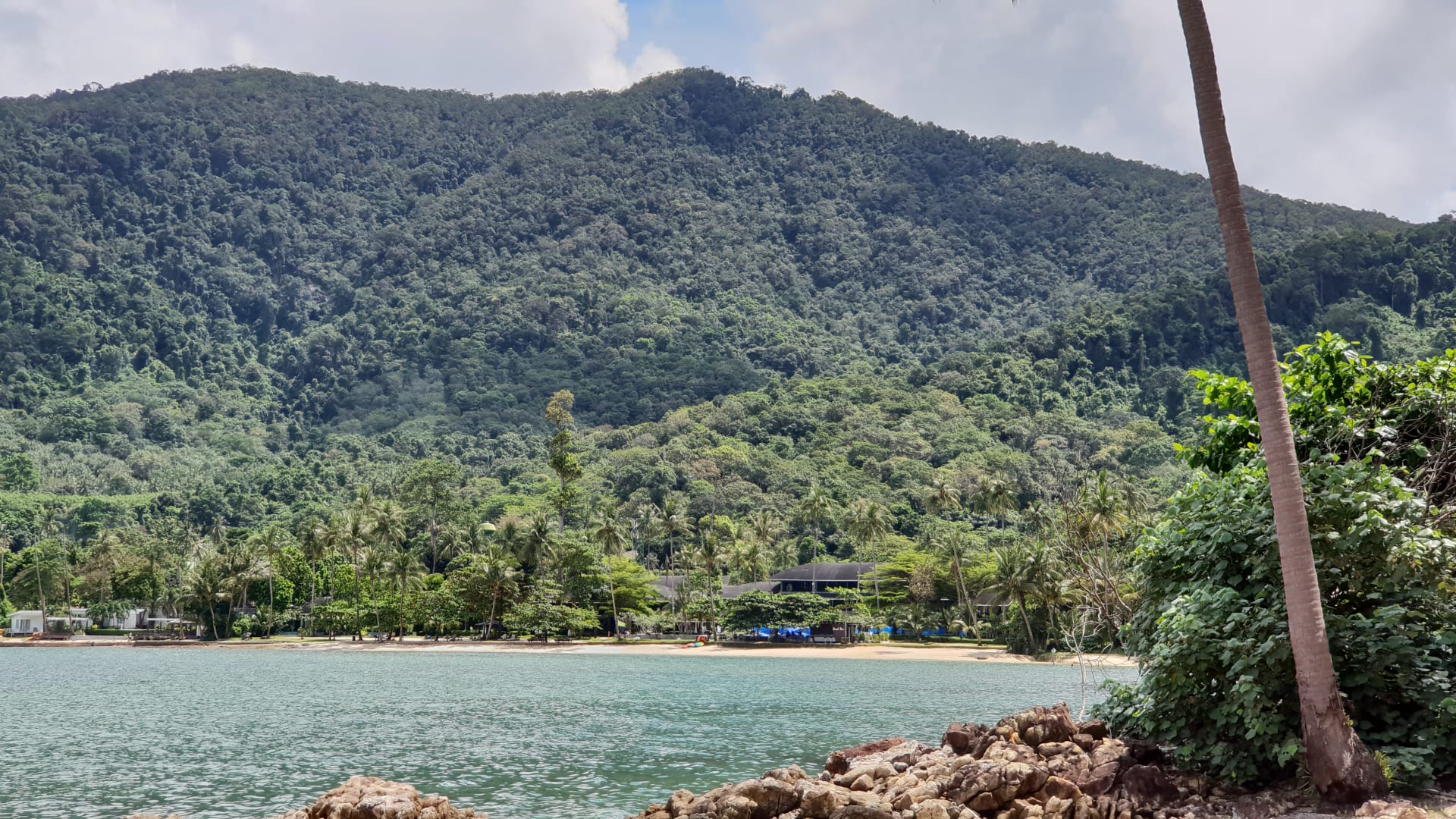 Blick auf Hotel vom Meer und im Hintergrund Urwald