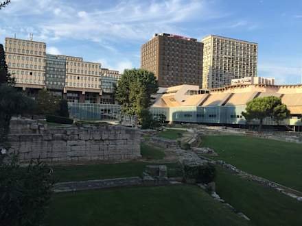 Blick über historische Ausgrabungsstätte zum Hotel