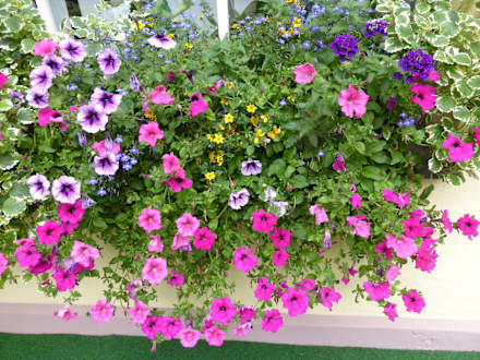 Vor allen Fenstern gibt es schöne Blumen