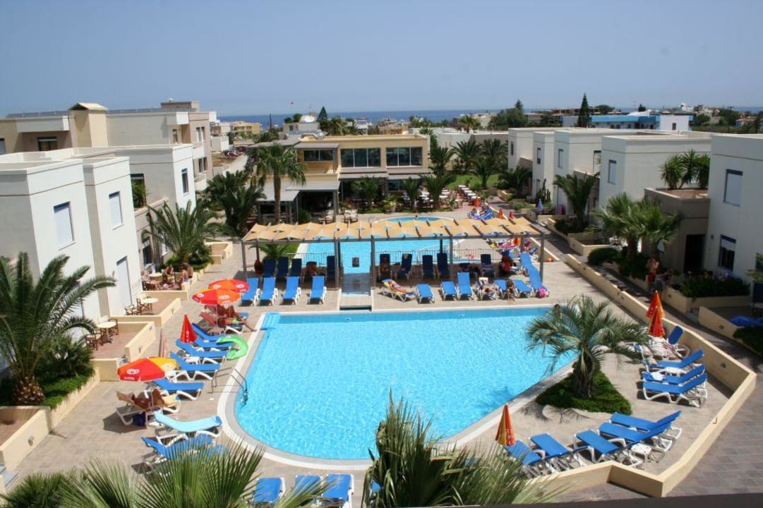 Hotelanlage im ÜberblickIm Vordergrund die beiden Pools im neueren Teil der Anlage, im Hintergrund das Restaurant und seitlich die Wohneinheiten.