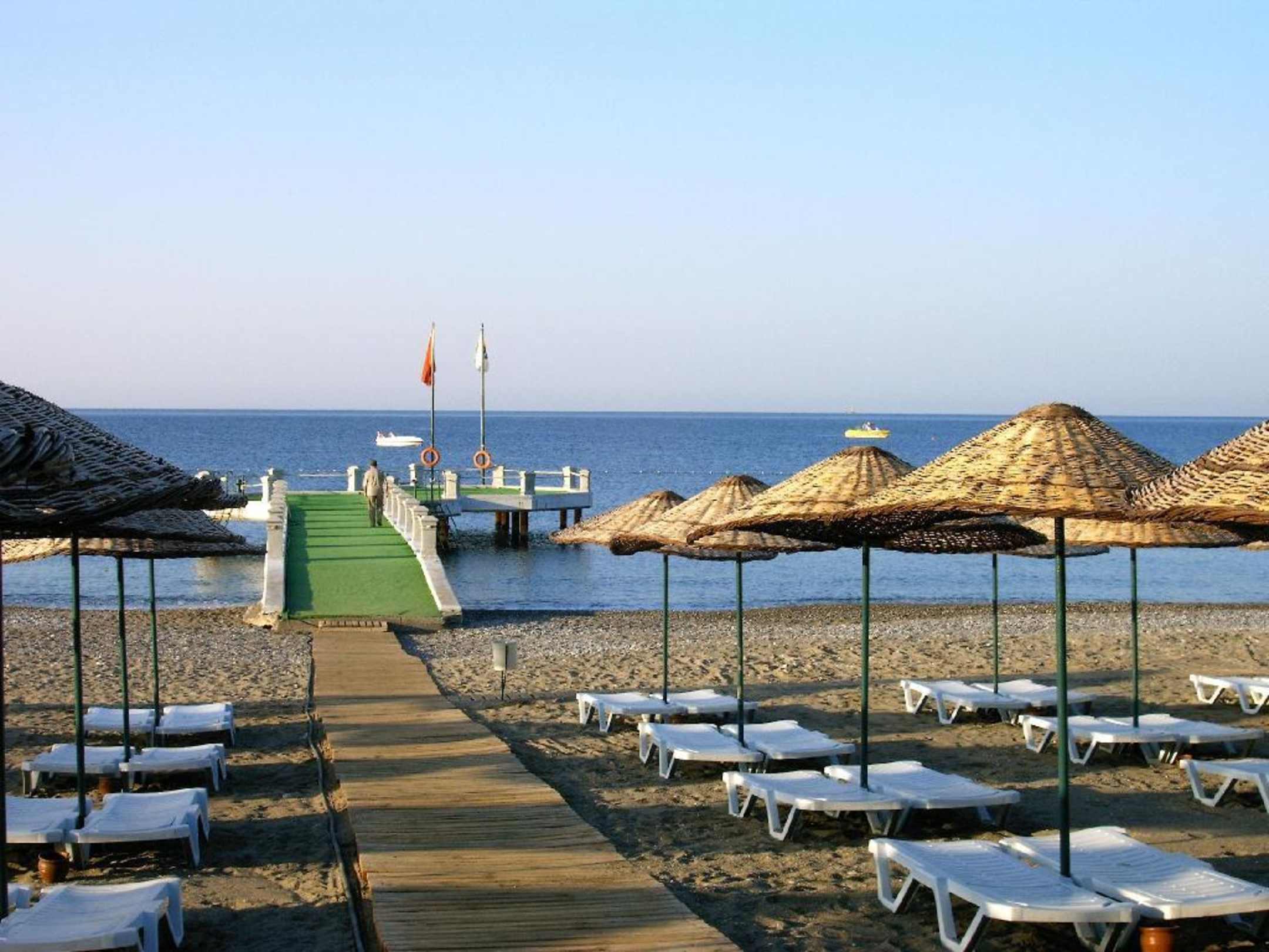 Strandbereich mit Liegen, Sonnenschutz und Blick zum Badesteg