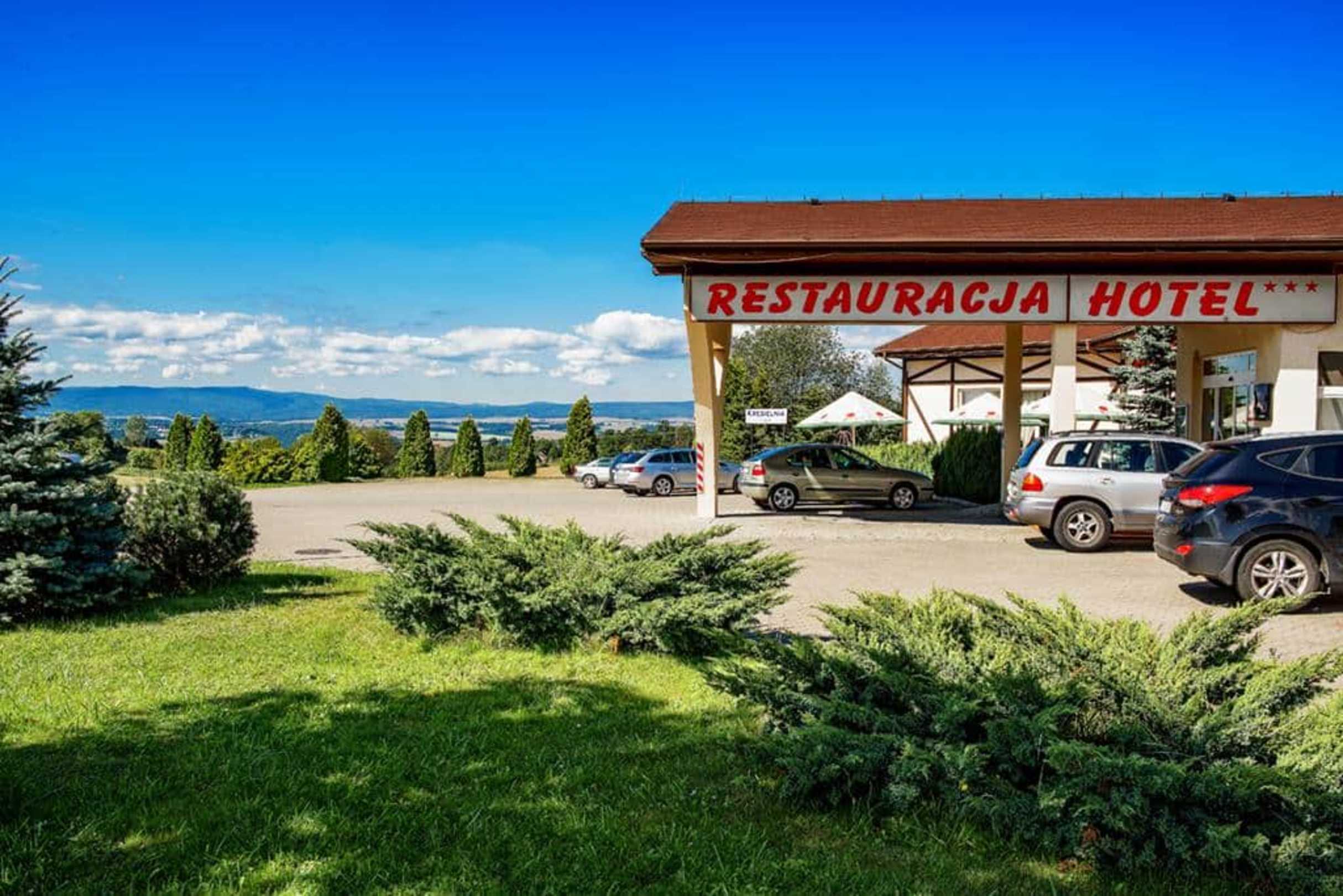 Widok na wejście do hotelu i panoramę gór