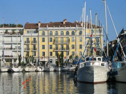 Hafen Grado und Hotel MetropolDer kleine Hafen von Grado, und das Hotel Metropol von aussen (das gelbe Gebäude)