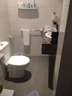 Das kleinste Bad, in dem ich je geduscht habe und nur genau 40cm zwischen Toilette und Waschbecken!