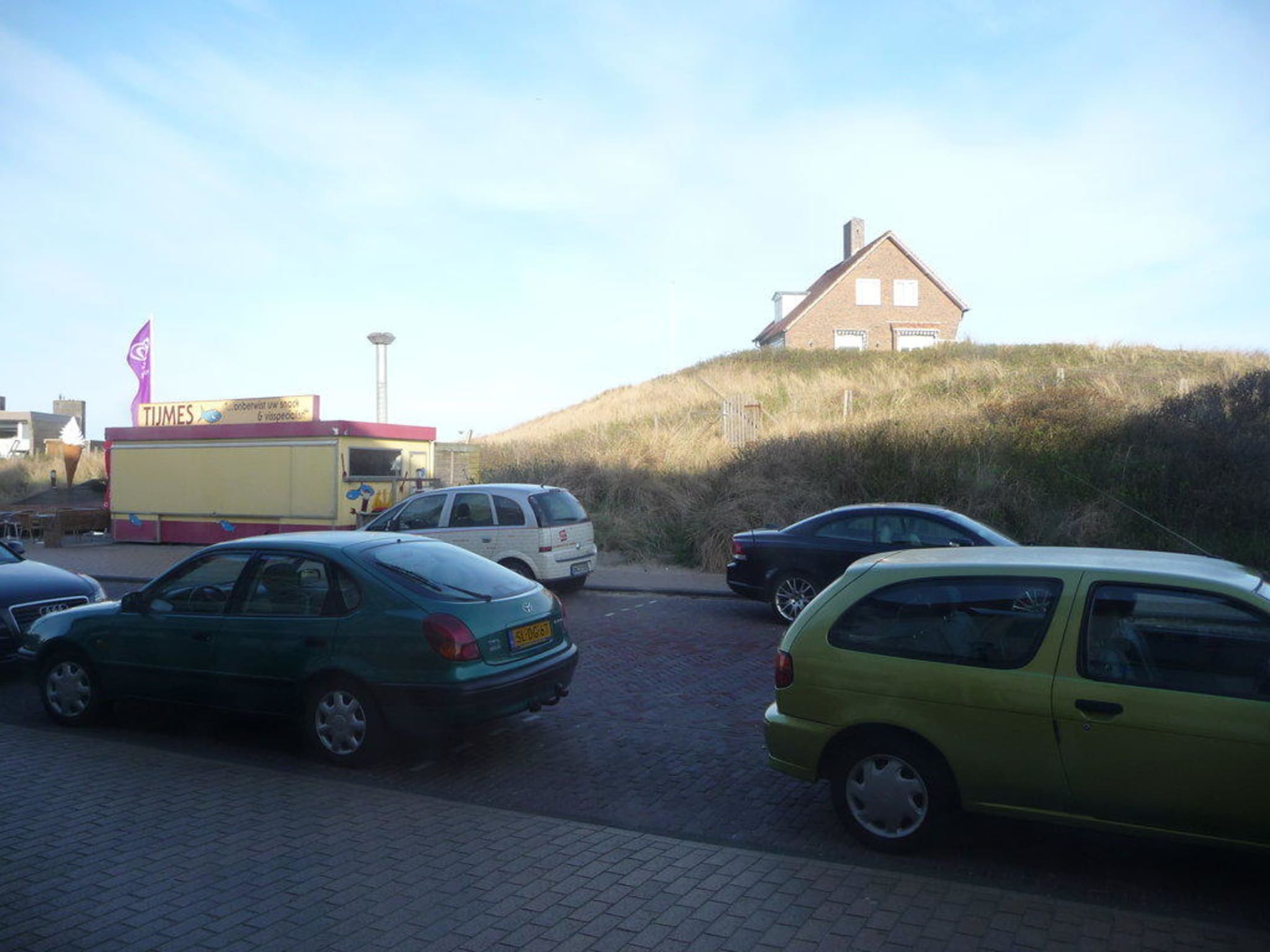 Blick aus dem Fenster auf Straße und Dünen