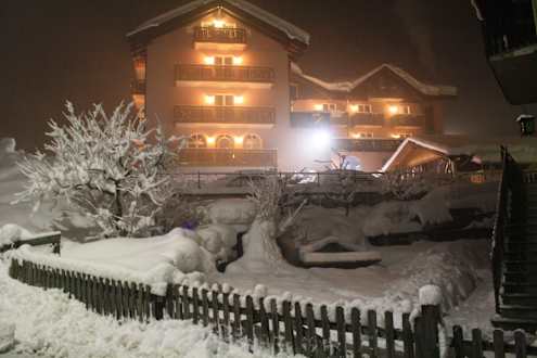 Hotel in notturna con la neve