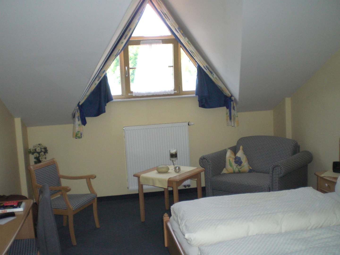 SitzgruppeGemütliche Sessel mit kleinem Tisch. Aus dem Fenster sieht man den Parkplatz, einige Bauernhöfe und dahinter einen Wald.