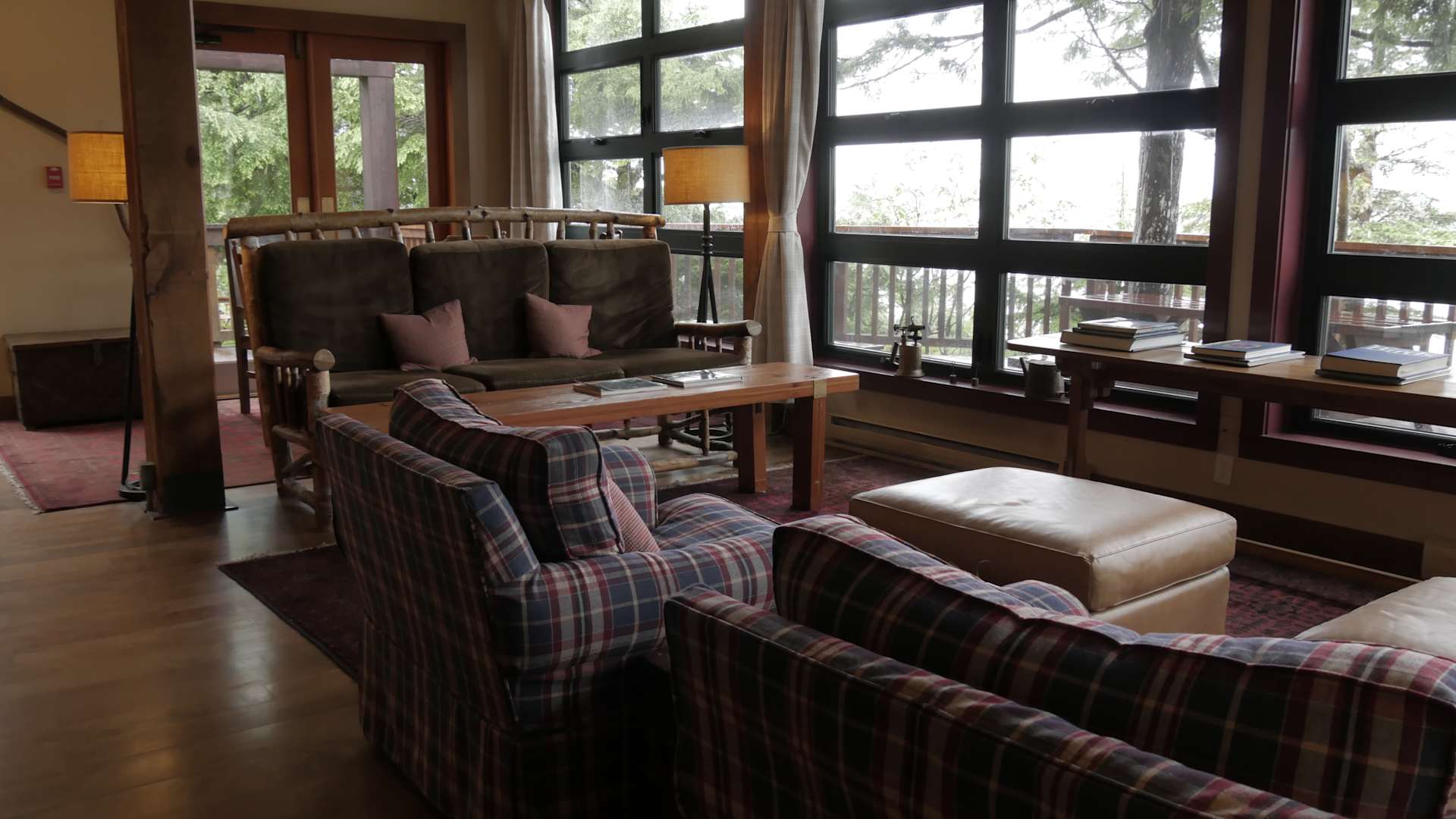 Aufenthaltsraum mit Kamin und toller Aussicht.