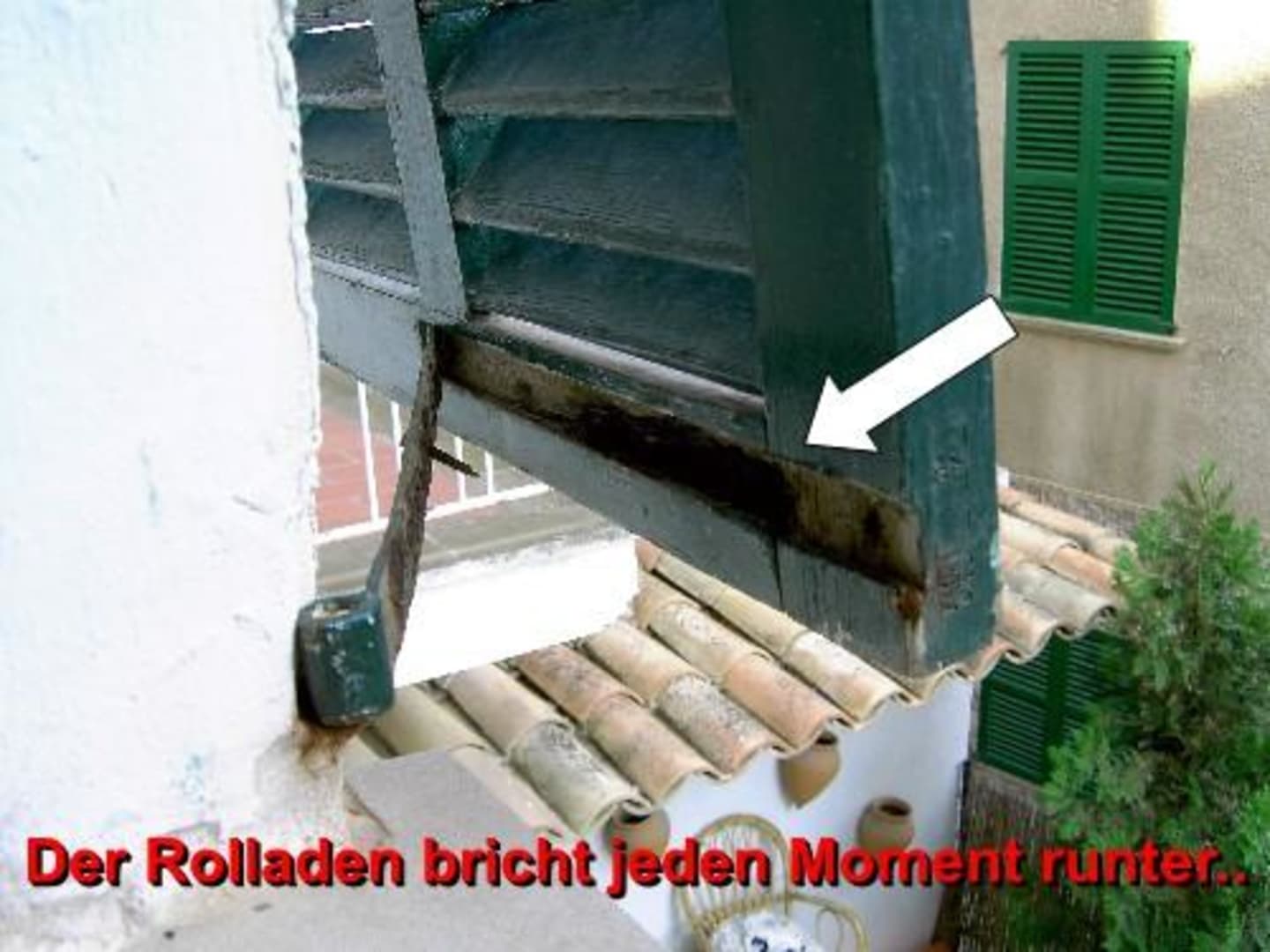 Die Fensterläden sind in einem sehr kritischen Zustand. Dieser hängt nur noch an einem Schrauben, und kann jeden Moment runterkrachen!