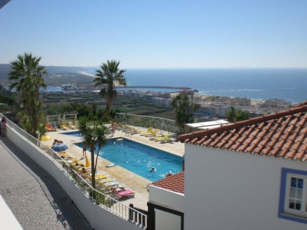 Blick vom HotelMeerblick mit Restaurant davor und Blick auf den sehr unsauberen Pool und Garten.