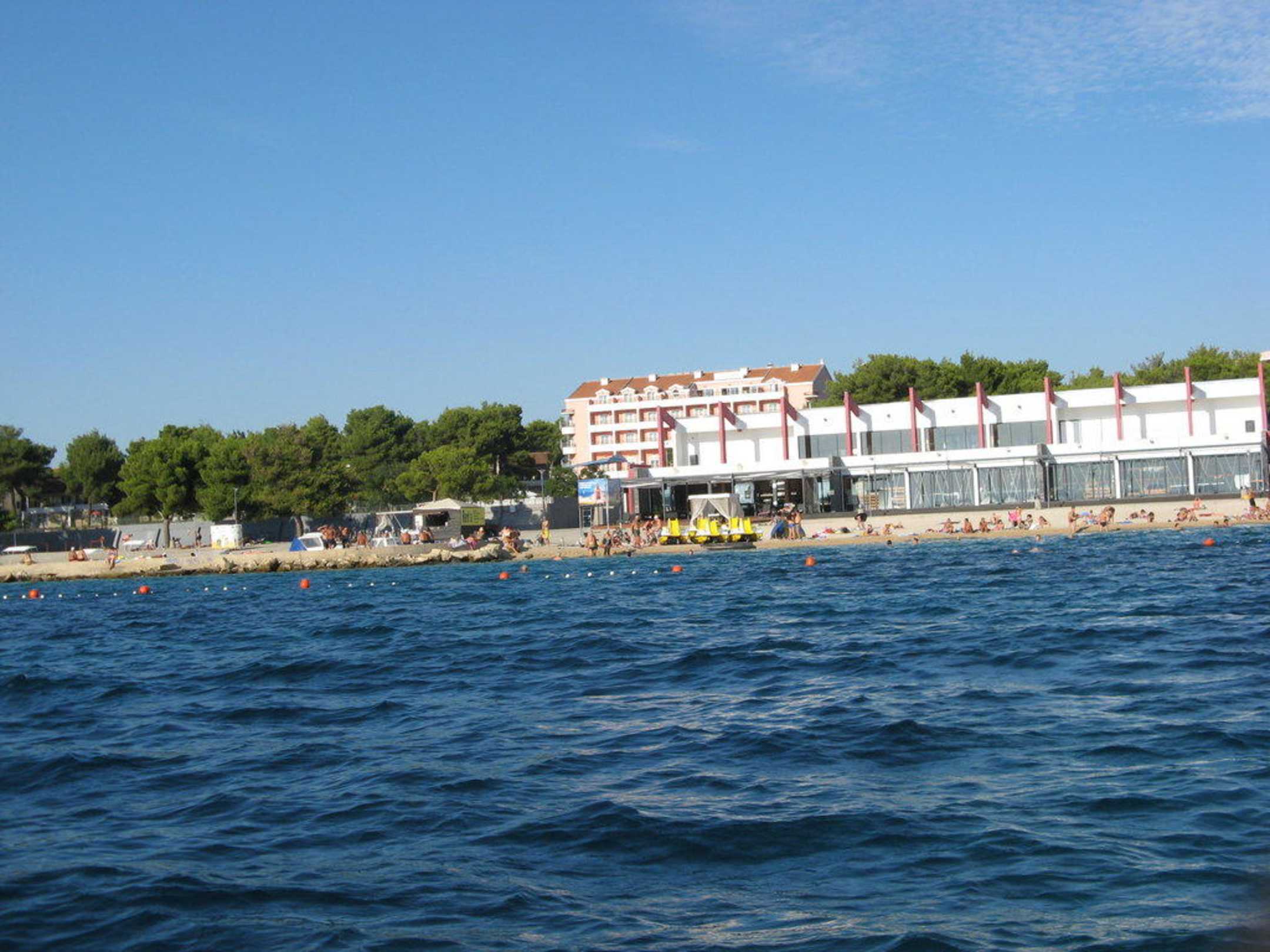 Hotel und Strand vom Wasser aus