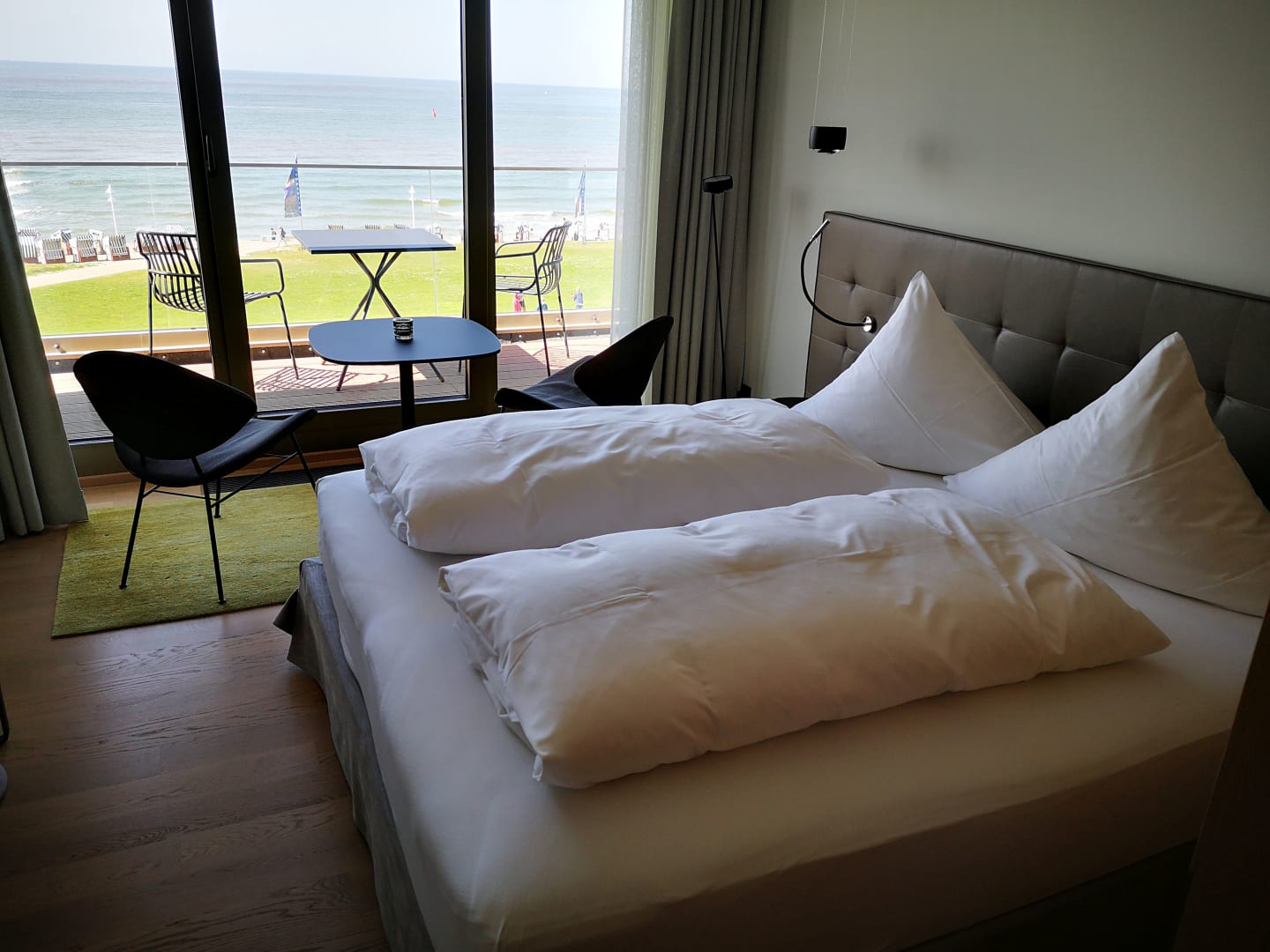 Doppelbett und Sitzbereich vor dem Balkon