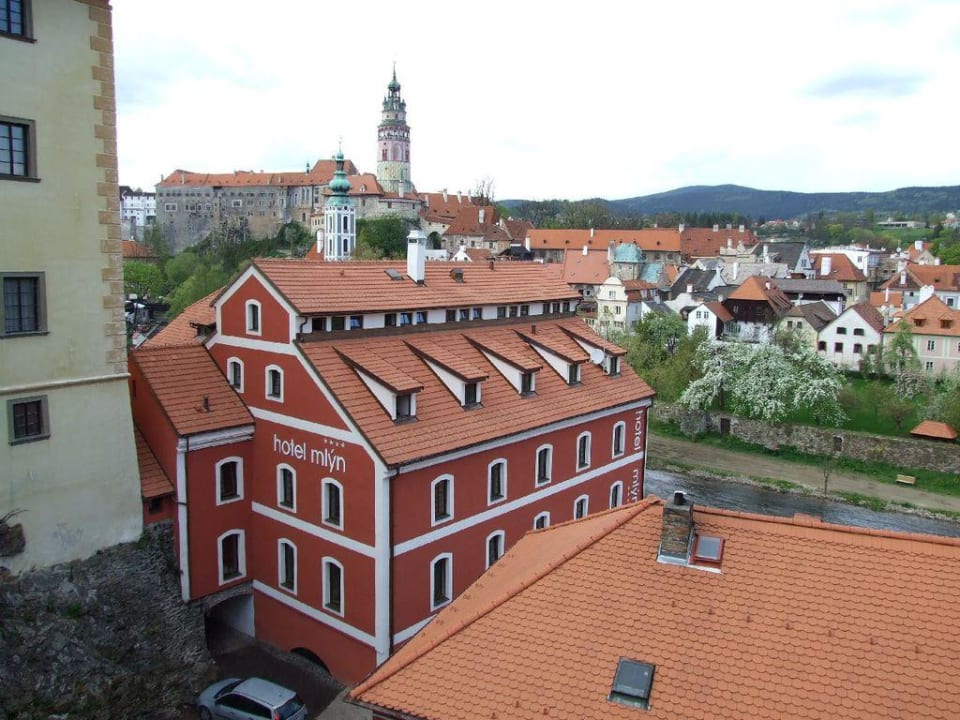 Hotel MlýnBlick von einer Brücke der Stadtbefestigung auf das Hotel. Gut zu sehen die schmale Zufahrt zum Hotelparkplatz durch den Torbogen.