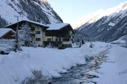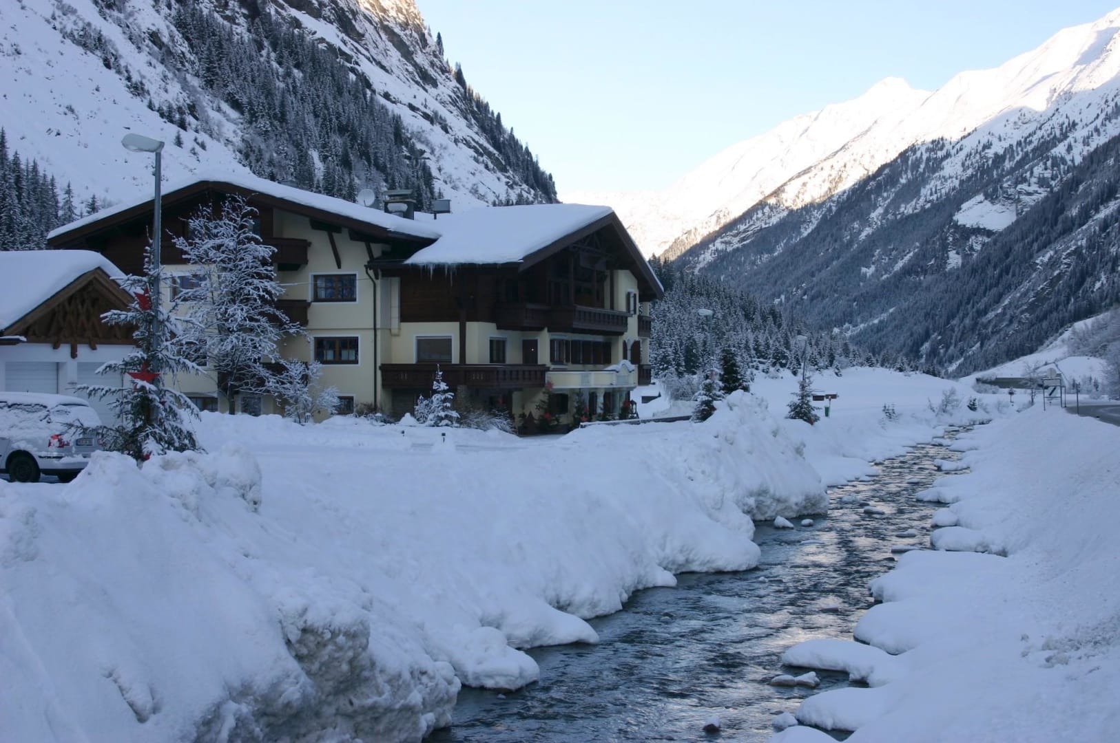 Verschneite Hotelansichtidyllische Lage direkt am Bach,