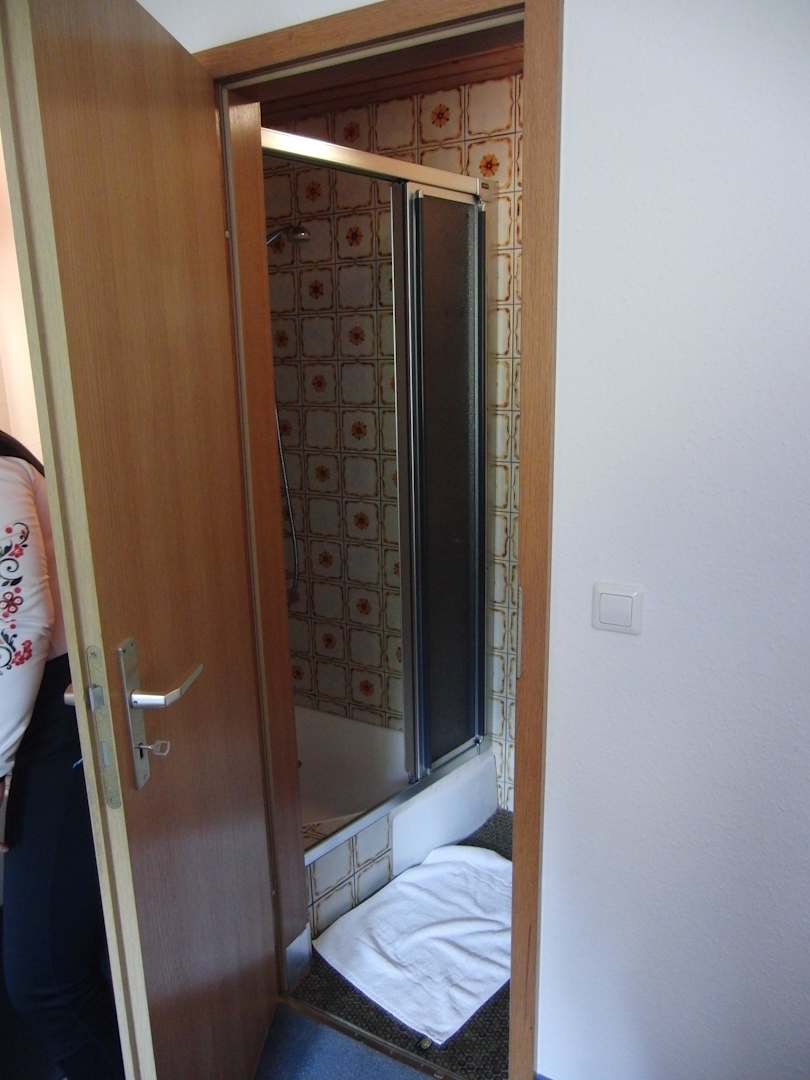 Badezimmer mit Dusche, Waschbecken befindet sich aus Platzmangel im Schlafzimmer.