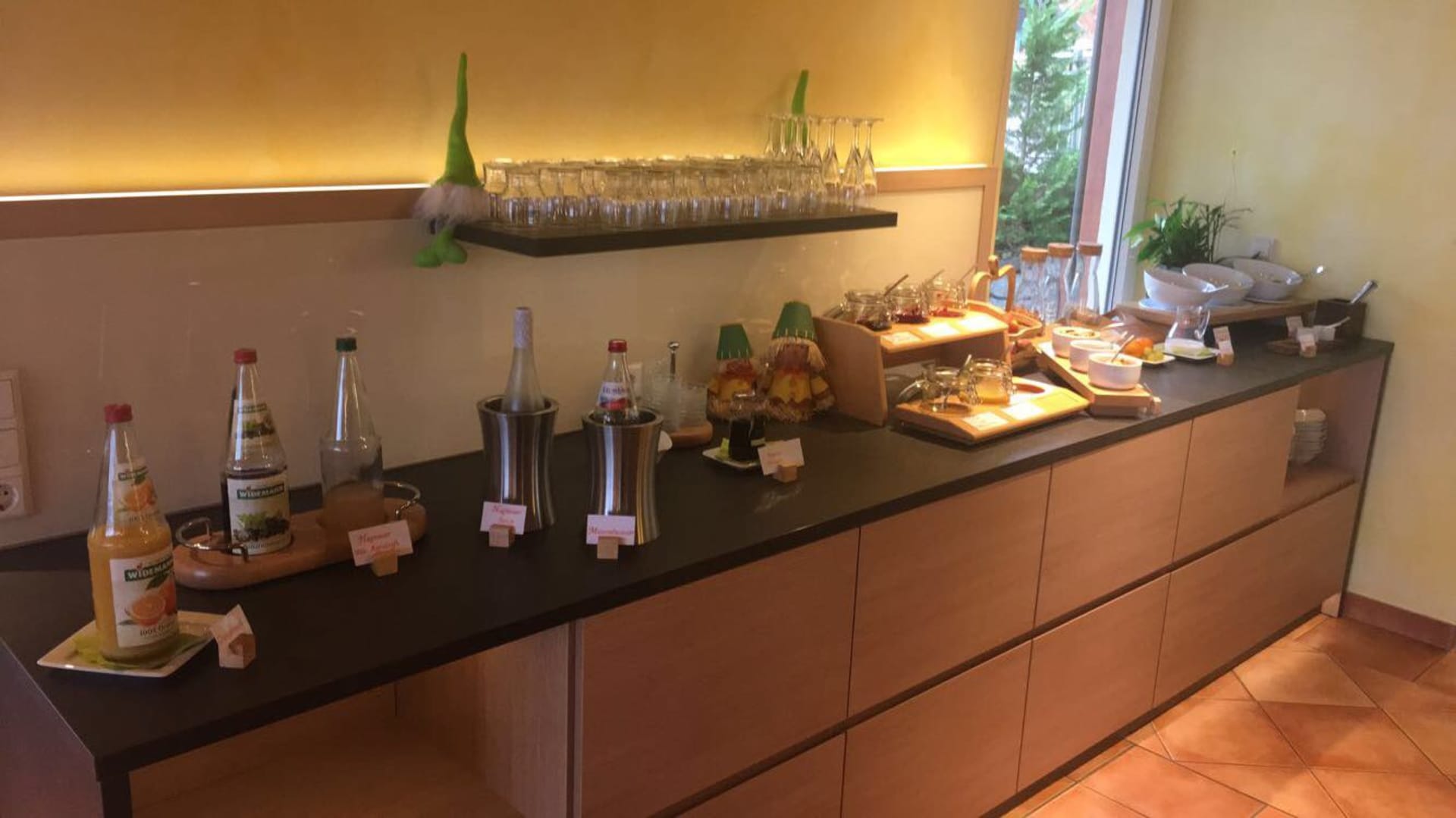 Frühstücksbuffet mit hauseigenen Marmeladesorten und Säften.