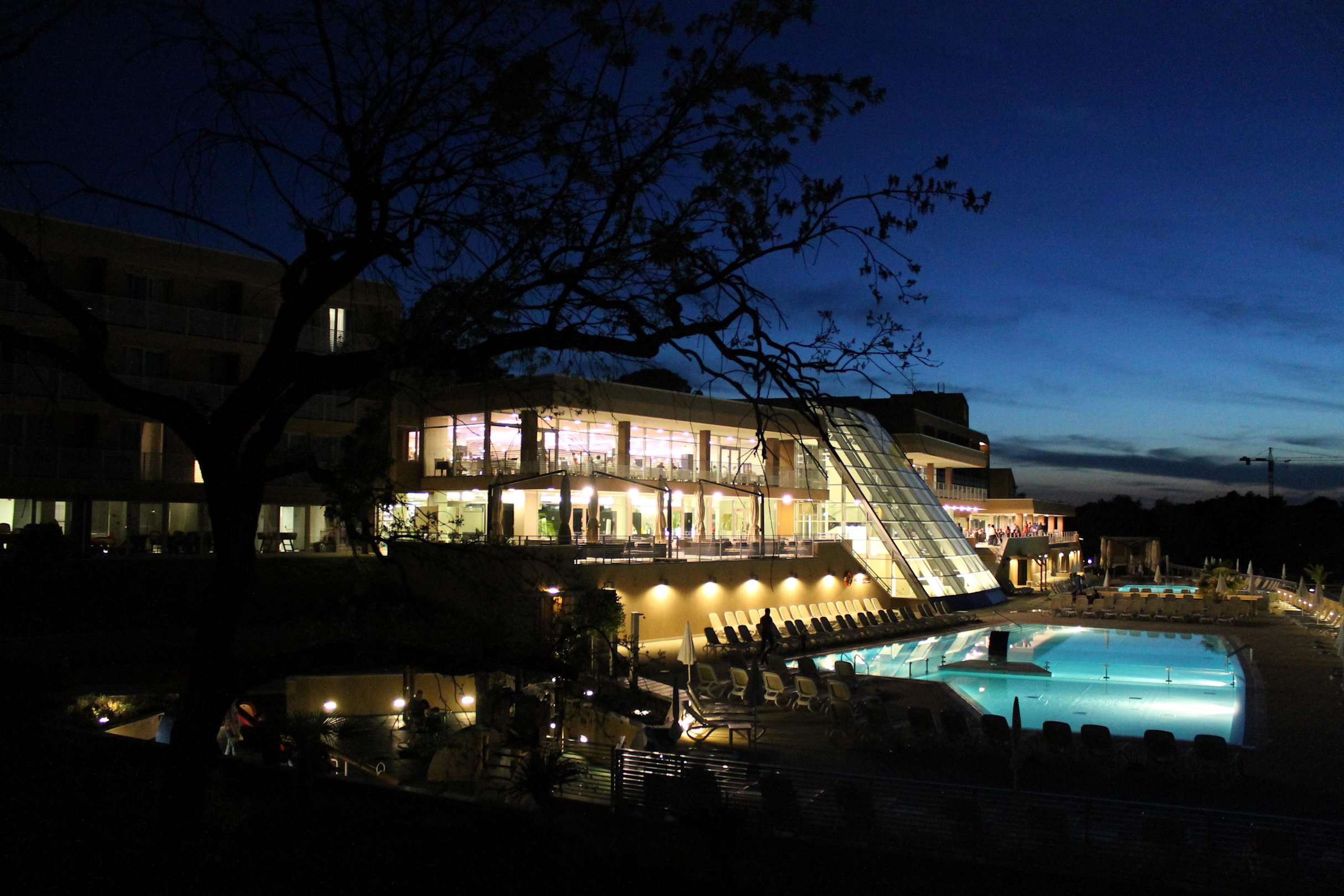 Widok z balkonu na baseny i restaurację