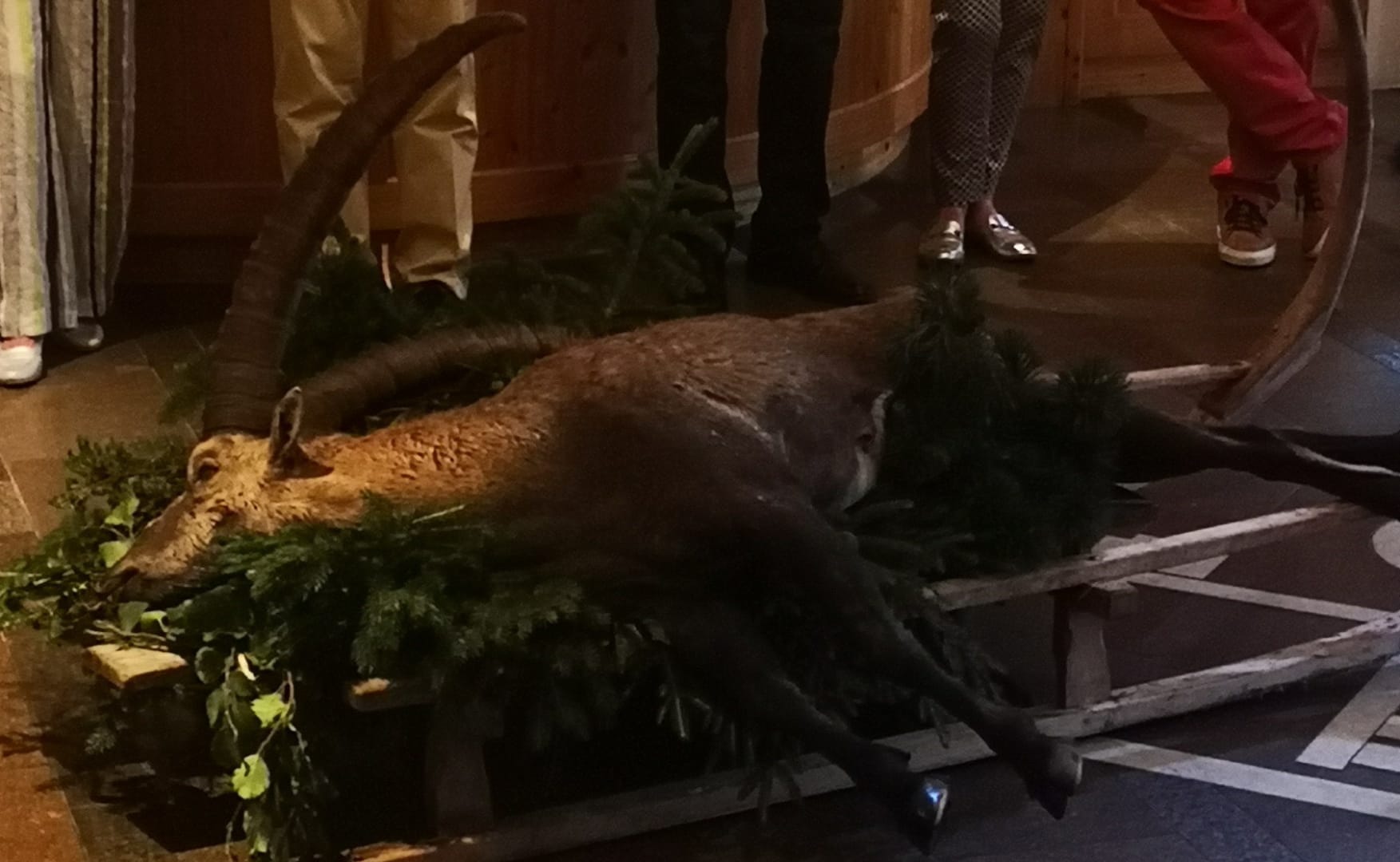Beim Gästeempfang wurde ein am frühen Morgen geschossener Steinbock präsentiert. Dabei wurden die Hintergründe geschildert, die einen Weidmann beim Abschuss dieser Tiere leiten.