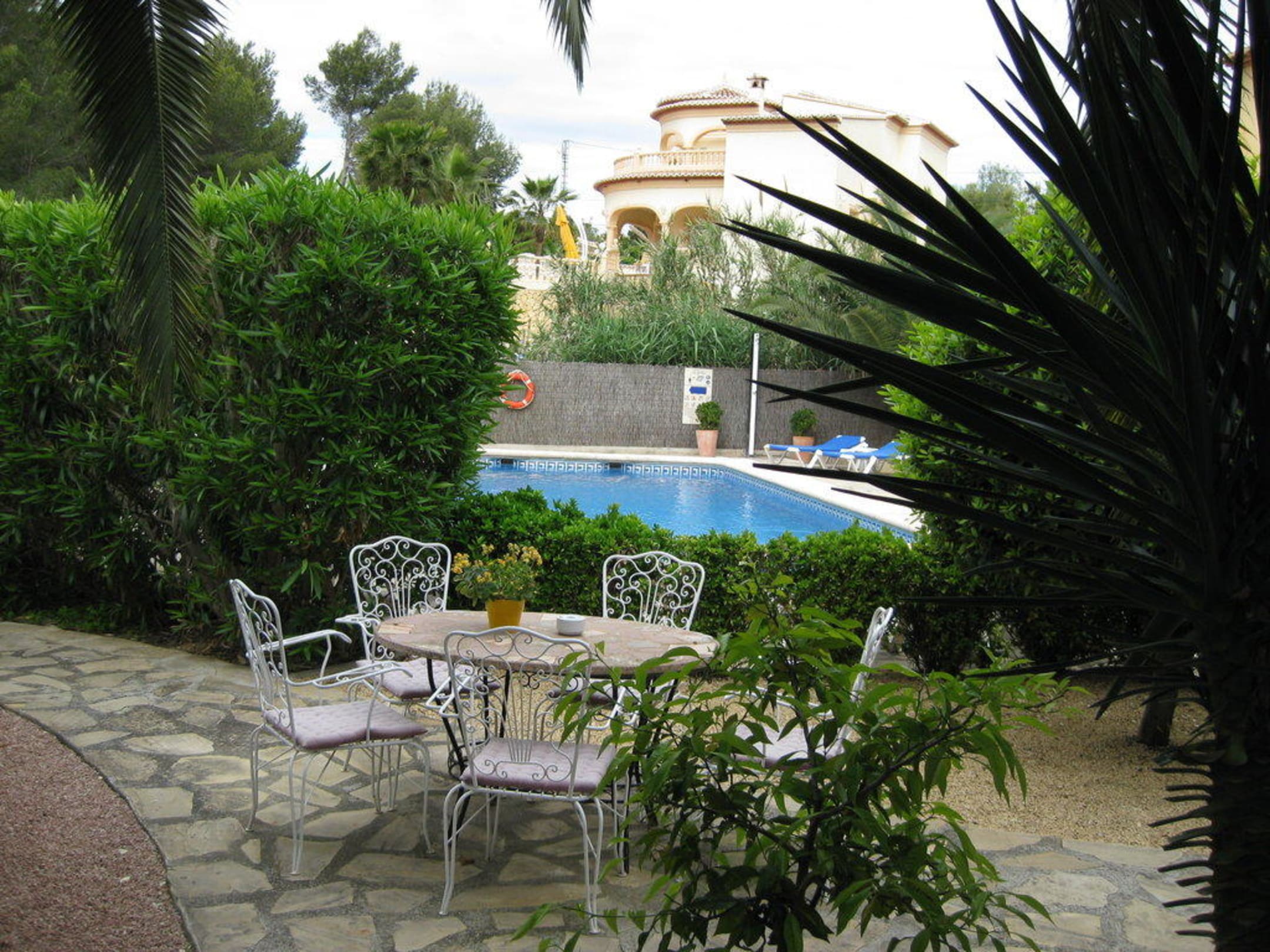 Blick von der Gartenterasse auf den Pool