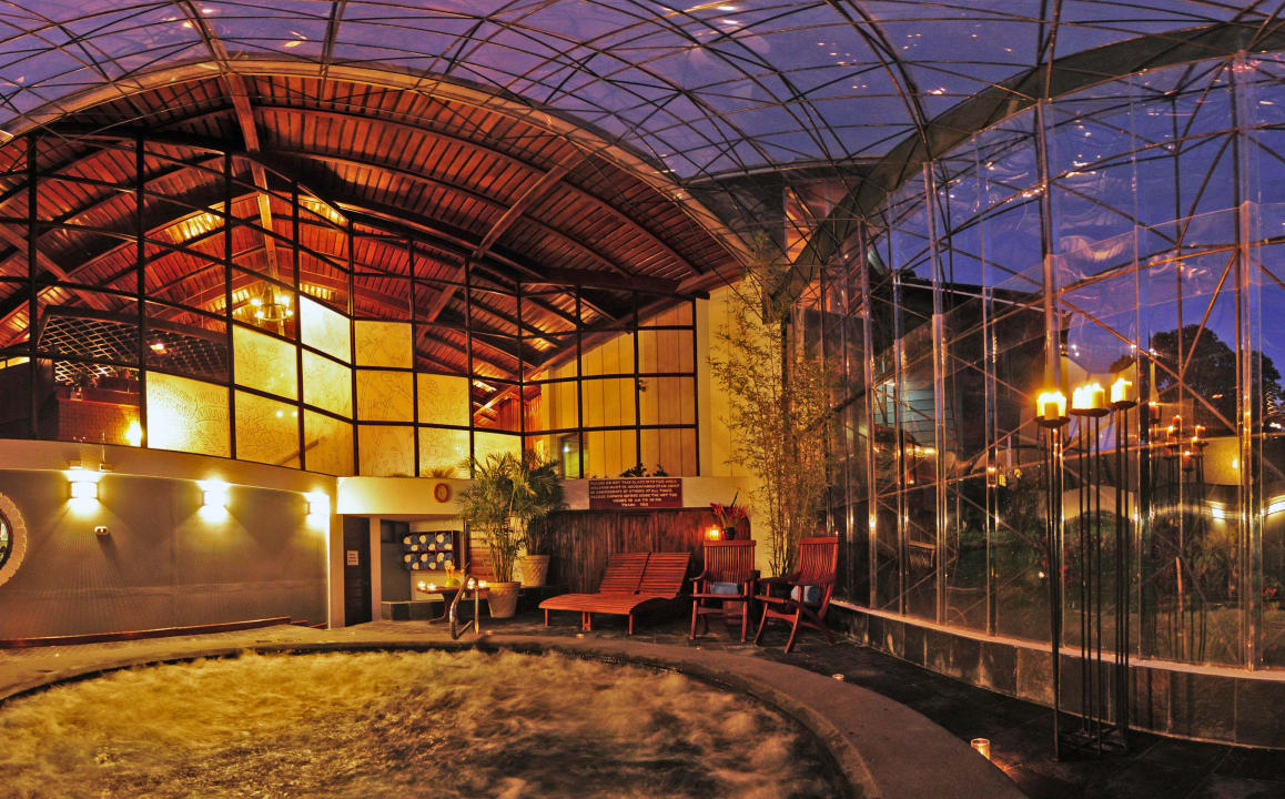 15 person jacuzzi in a glass enclosed atrium