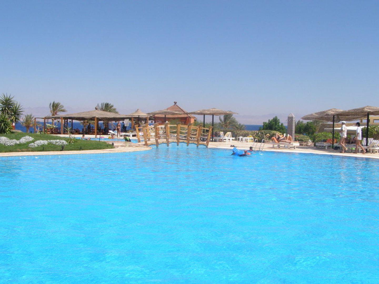 za basenem widac bar gdzie można dostac m.in. pizzę, w tle morze