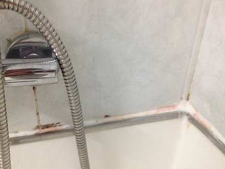 Dunkler und rosa Schimmelbelag in der Dusche