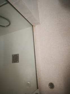 Schimmelige und verkalkte Dusche. Der Abfluss hat öfter gerochen und man hat jeden Toiletten- und Duschgang der Bewohner in den umliegenden Zimmern hören können.