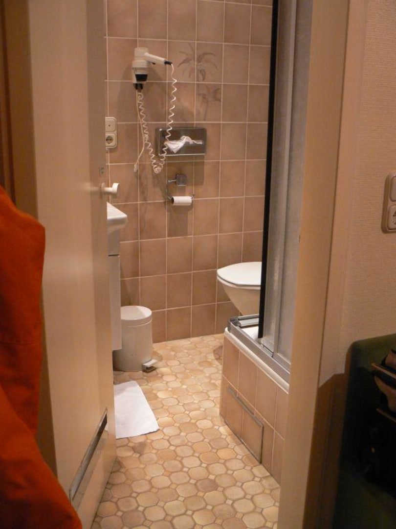 Klein und sehr altmodisch. Fön und Kosmetiktücher vorhanden.