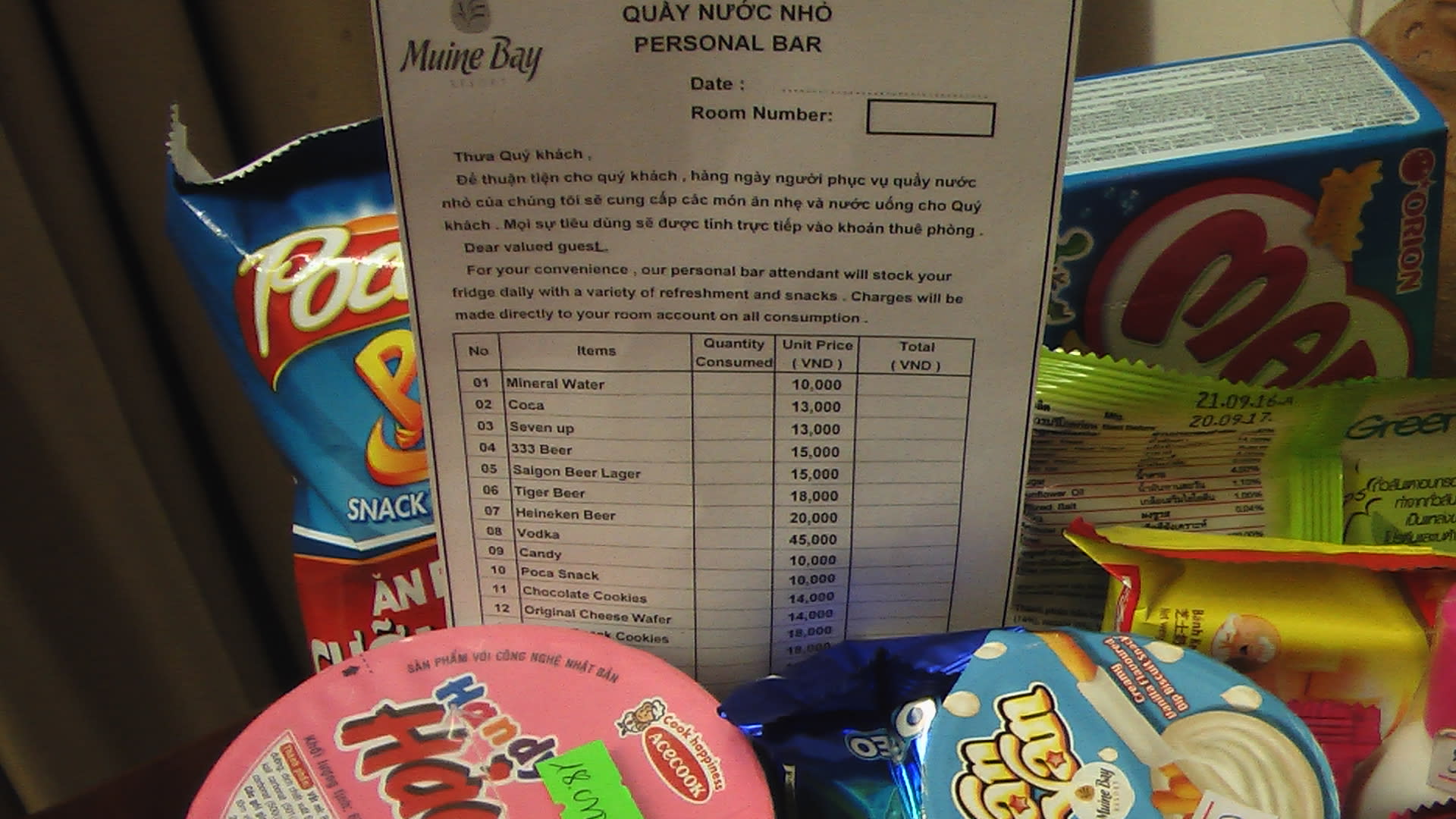 Mnibar Preiseliste , wo gleich die Snacks sind