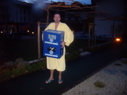 Die Holzblocksauna lädt mit verschiedenen Aufgüssen ein. Der beste Aufguss war der Bieraufguss mit Schneider Weisse für die Saunagäste. Saunawart Günther trägt gerade die "Freudenspender" in die Sauna.