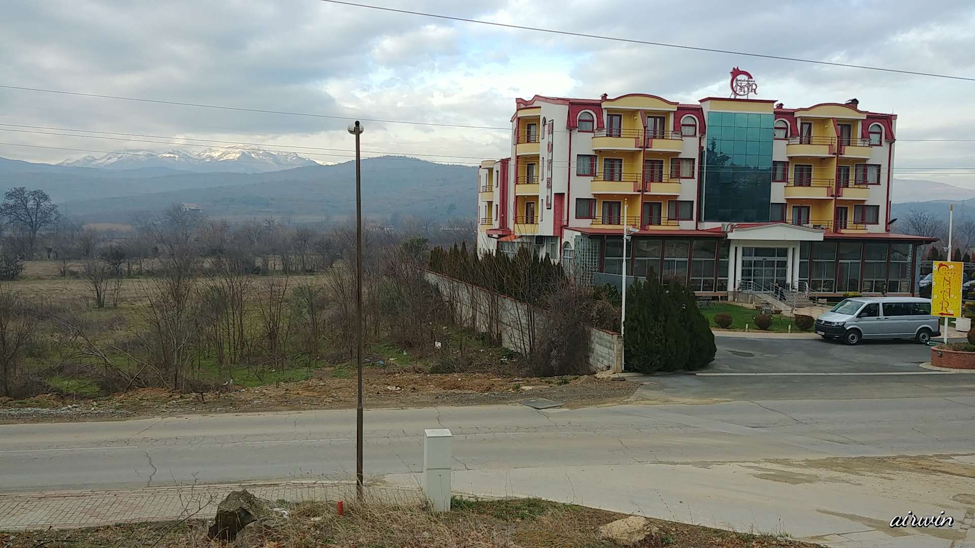 Hotel Nar von der Straße aus gesehen - dahinter liegt das Kozuf-Gebirge