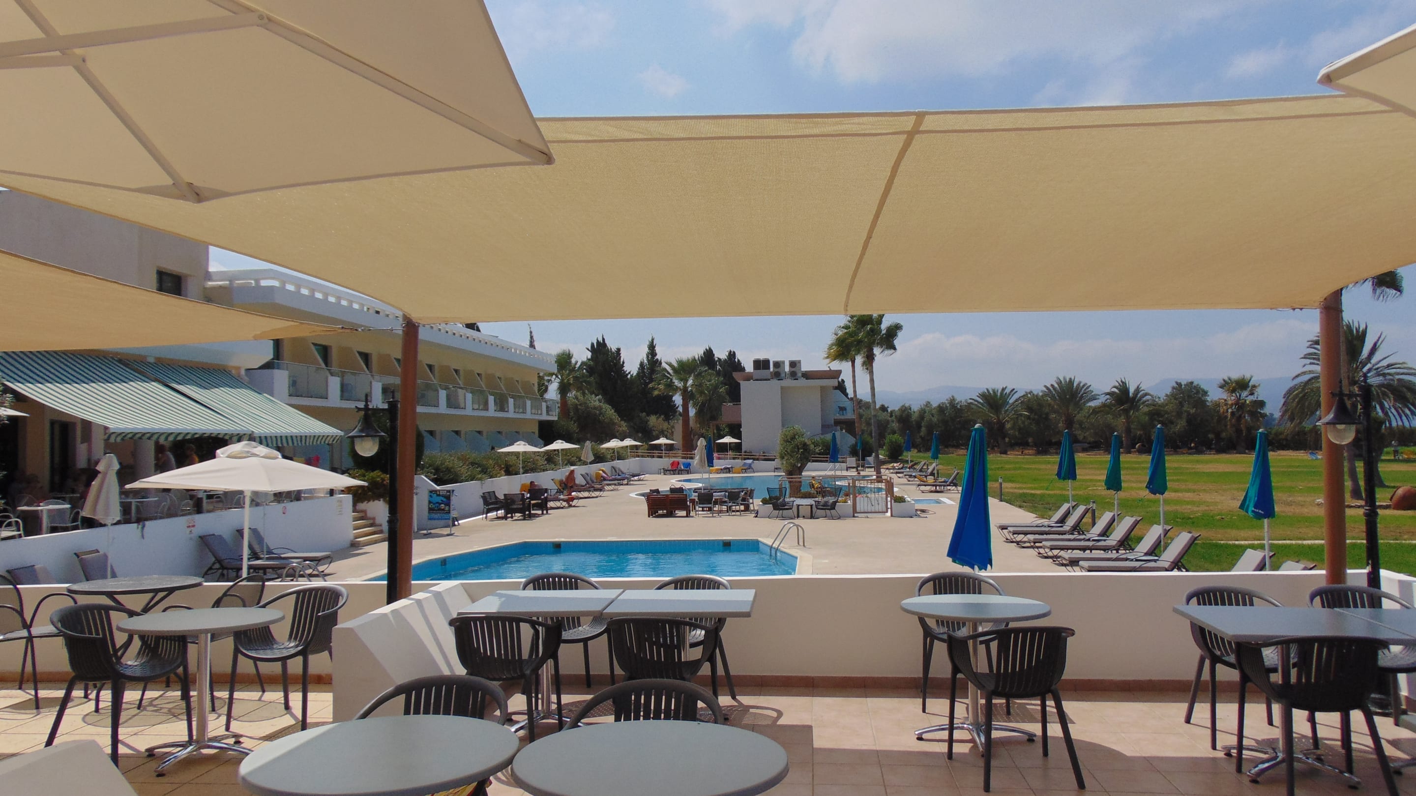 Blick von der Frühstücks-Abendbrotterrasse Richtung der Poolanlage