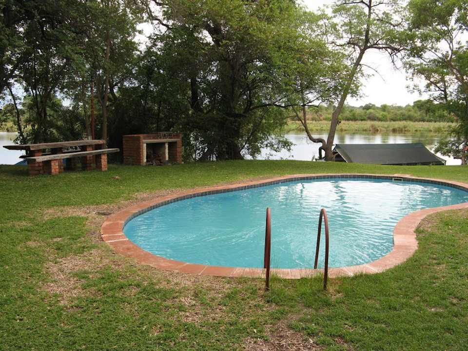 Auch für wohltuende Erfrischung ist gesorgt! Im Hintergrund ist der Okavango River zu erkennen.