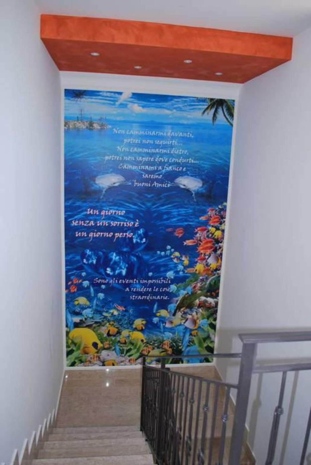 splendido murales sulla scala, paesaggio marino con didascalie di frasi toccanti.