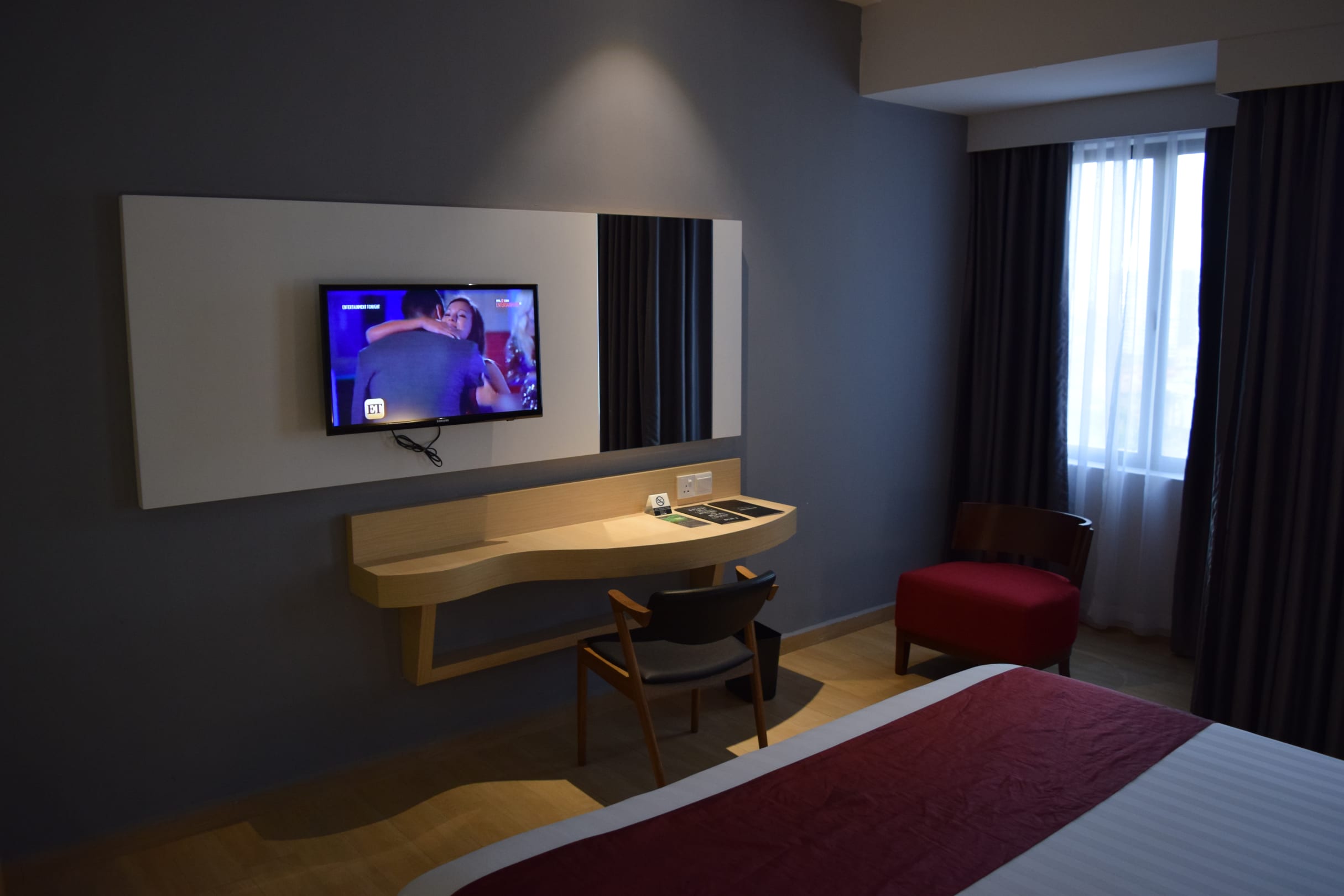 ZimmerDoppelzimmer. Blick vom Bett auf die gegenüberliegende Wand mit Sessel, Schreibtisch und TV-Gerät