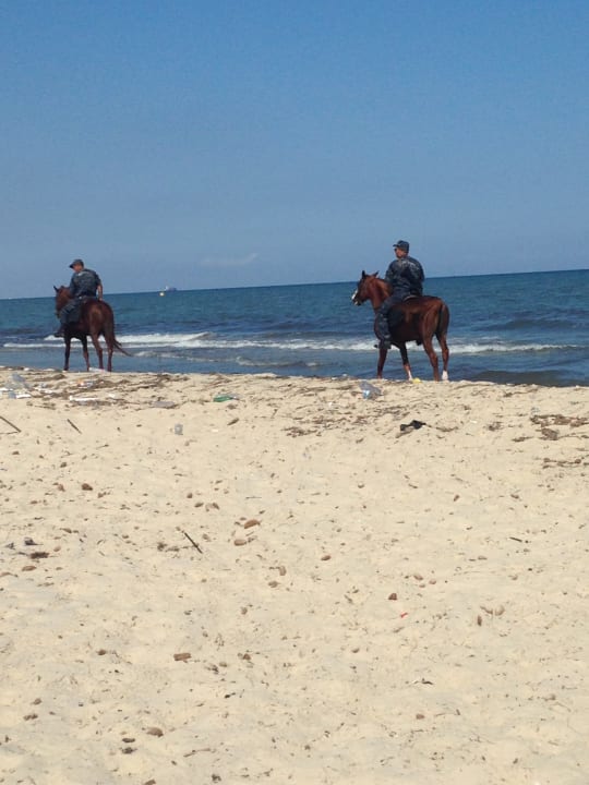 Bewaffnete Polizeistreife zu Pferde am Strand