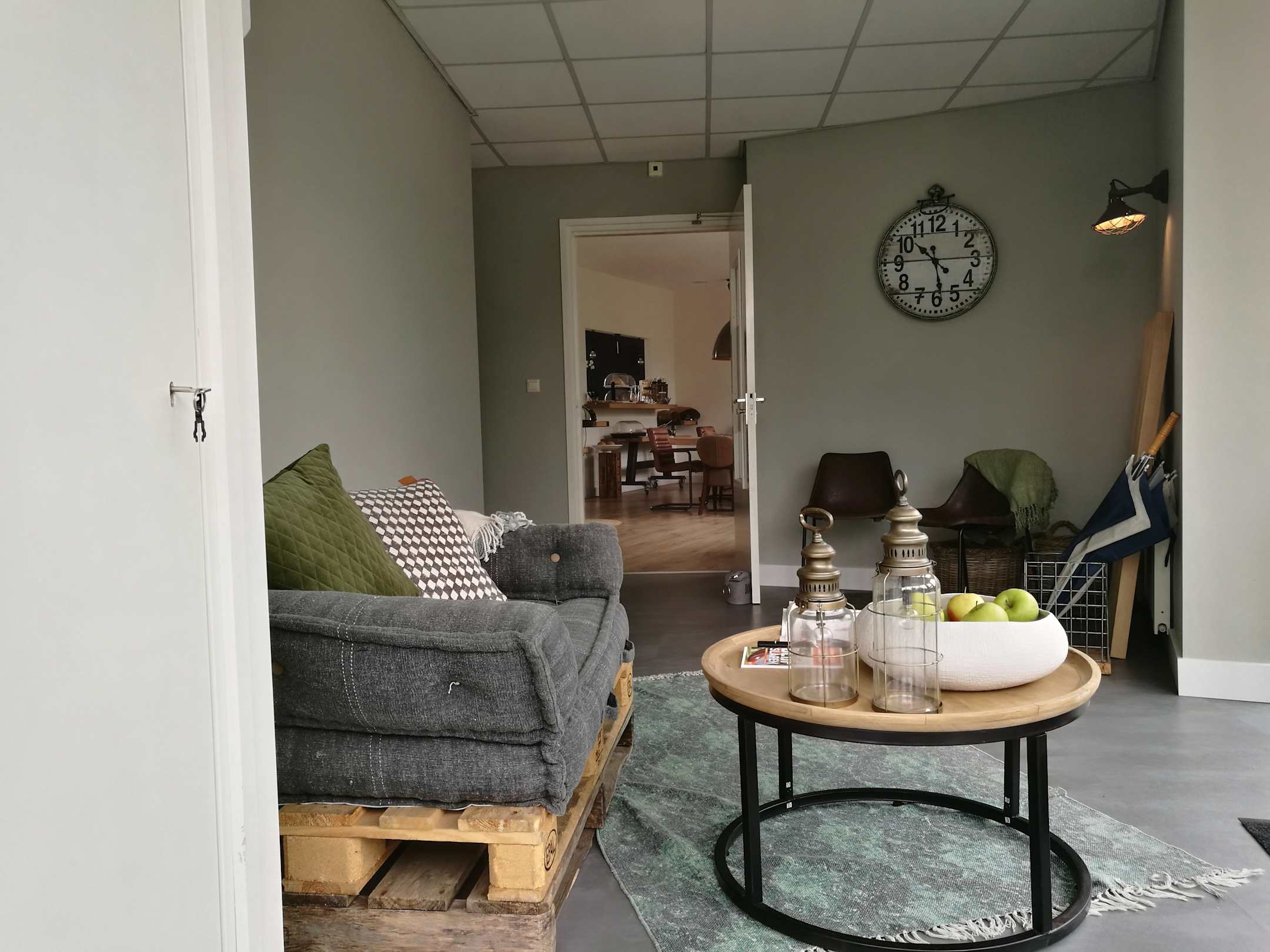 Sitzgruppe im Eingang, auf dem Tisch: Äpfel