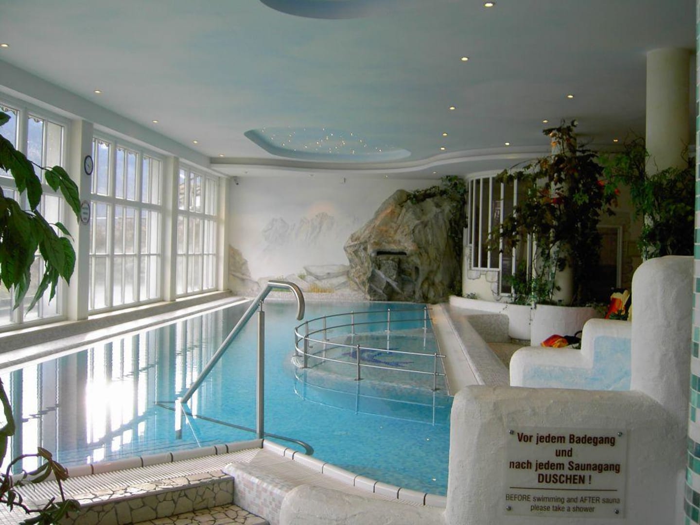Schwimmbecken mit Whirlpool (rechts, leider nicht zu erkennen), integriertem Babybecken, Massagedüsen, Wasserfall und Gegenstromanlage.