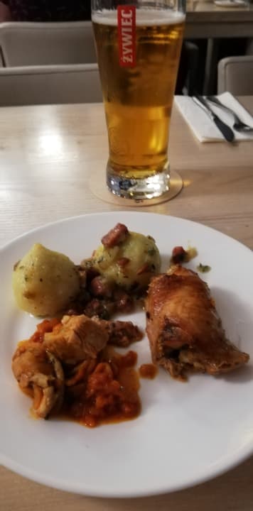 Gastroein leckeres Essen vom Büffet, Hähnchen und ein pikantes Ragout, Klöße mit Hack und Zwiebeln gefüllt, sehr gut, das Bier süffig