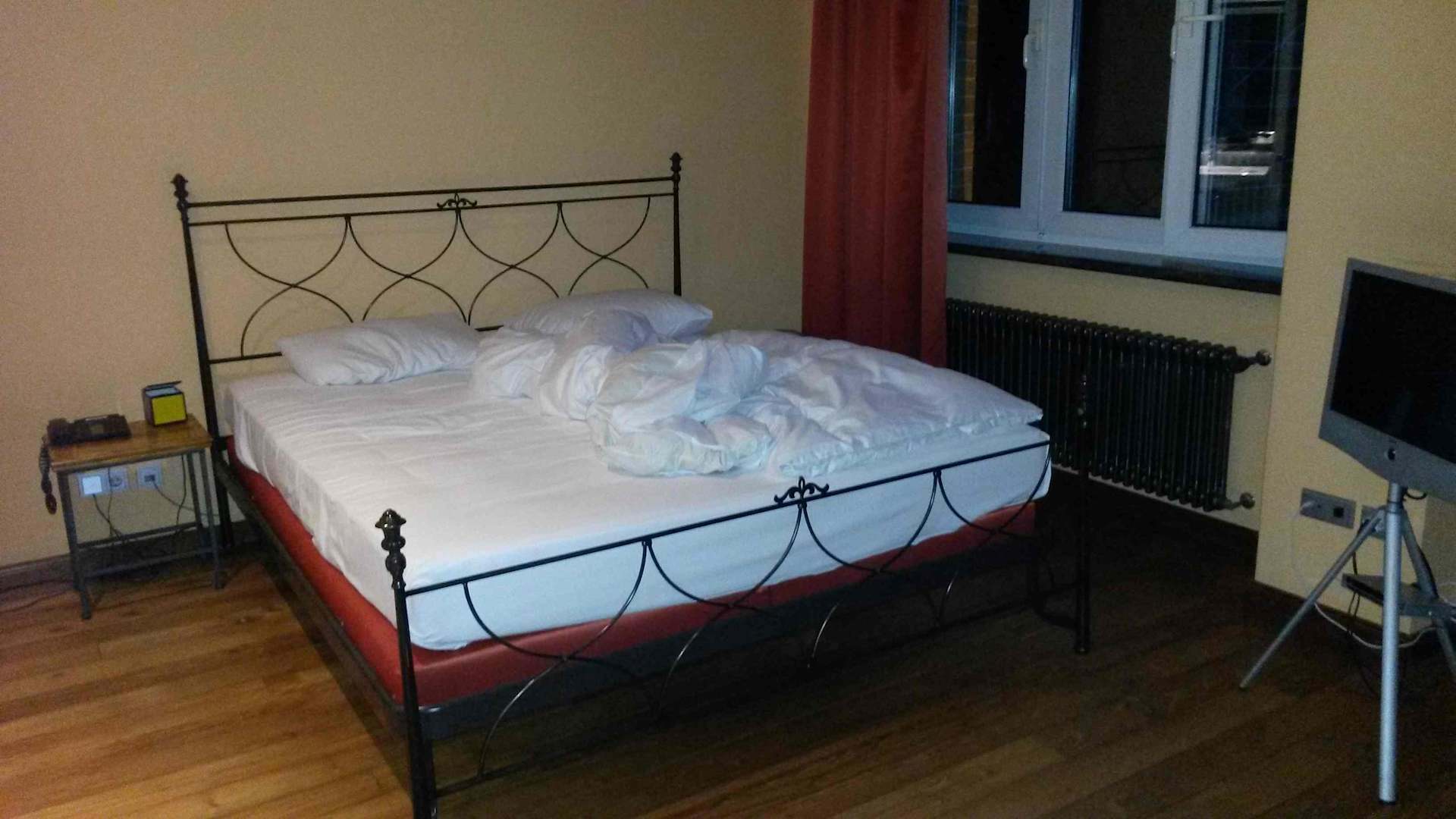 Statt der im Internet beschriebenen "modernen Zimmer" bekommt man alte Dielen & IKEA-Mobiliar. Statt beworbenem 116cm- TV ein 38cm-Mini-Kleinstgerät. Zimmer im Hinterhaus