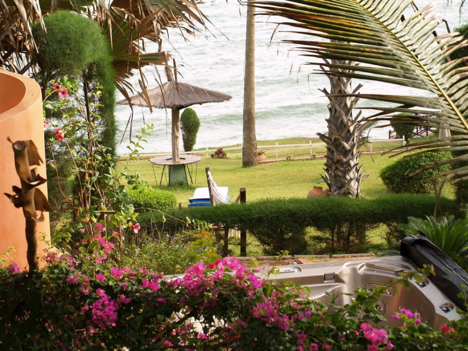 Blick vom Spa über den Garten zum Meer