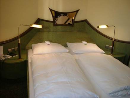 NH Hotel Bingen am RheinDoppelbett im Zimmer 311 - Ablage hinter dem Bett und Telefonkabel - Steckdosen haben schon länger keinen Staublappen gesehen.